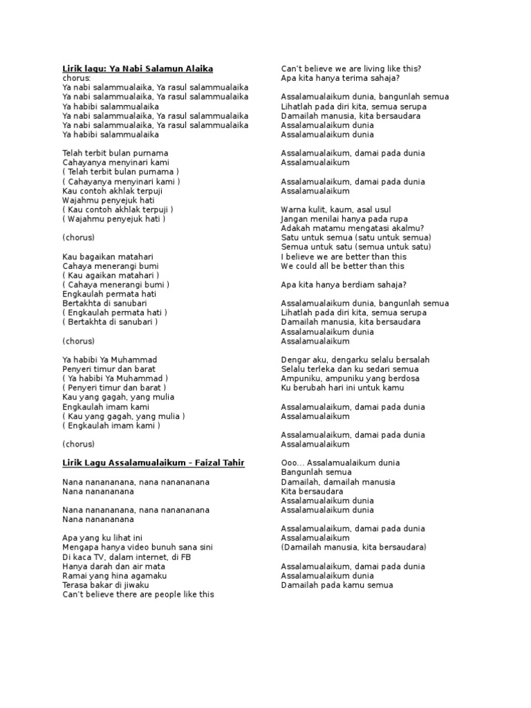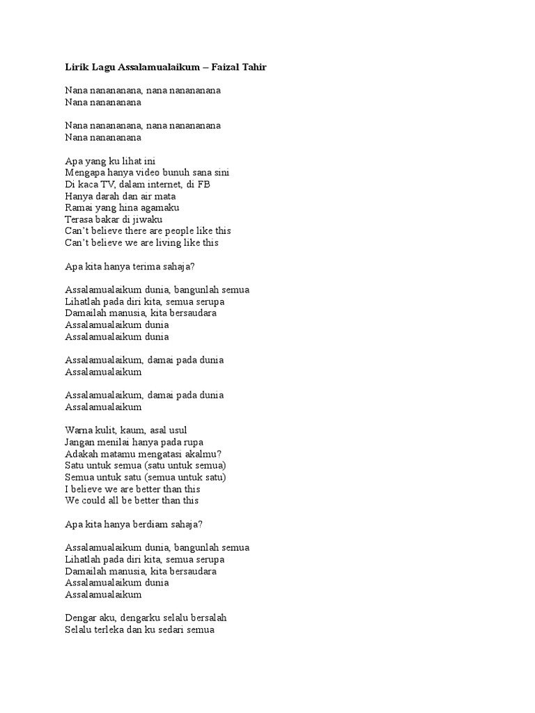 Apa yang ku lihat ini. Get Lirik Lagu Assalamualaikum Faizal Tahir MP3 For Free in Top Song uploaded by Warner Music Malaysia. Lirik Lagu Assalamualaikum - Faizal Tahir Nana nanananana nana nanananana Nana nanananana Nana nanananana nana nanananana Nana nanananana Apa yang ku lihat ini Mengapa hanya video bunuh sana sini Di kaca TV dalam internet di FB Hanya darah dan air mata Ramai yang hina agamaku Terasa bakar di jiwaku Cant believe there are people like this Cant.